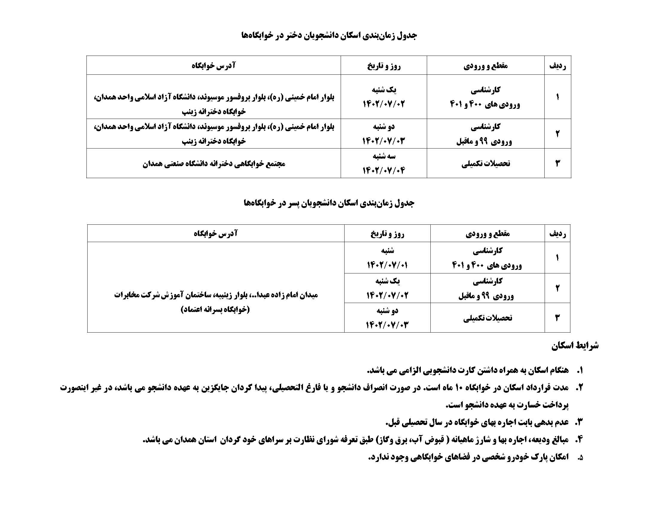 اطلاعیه جدول زمانبندی اسکان دانشجویان در خوابگاه