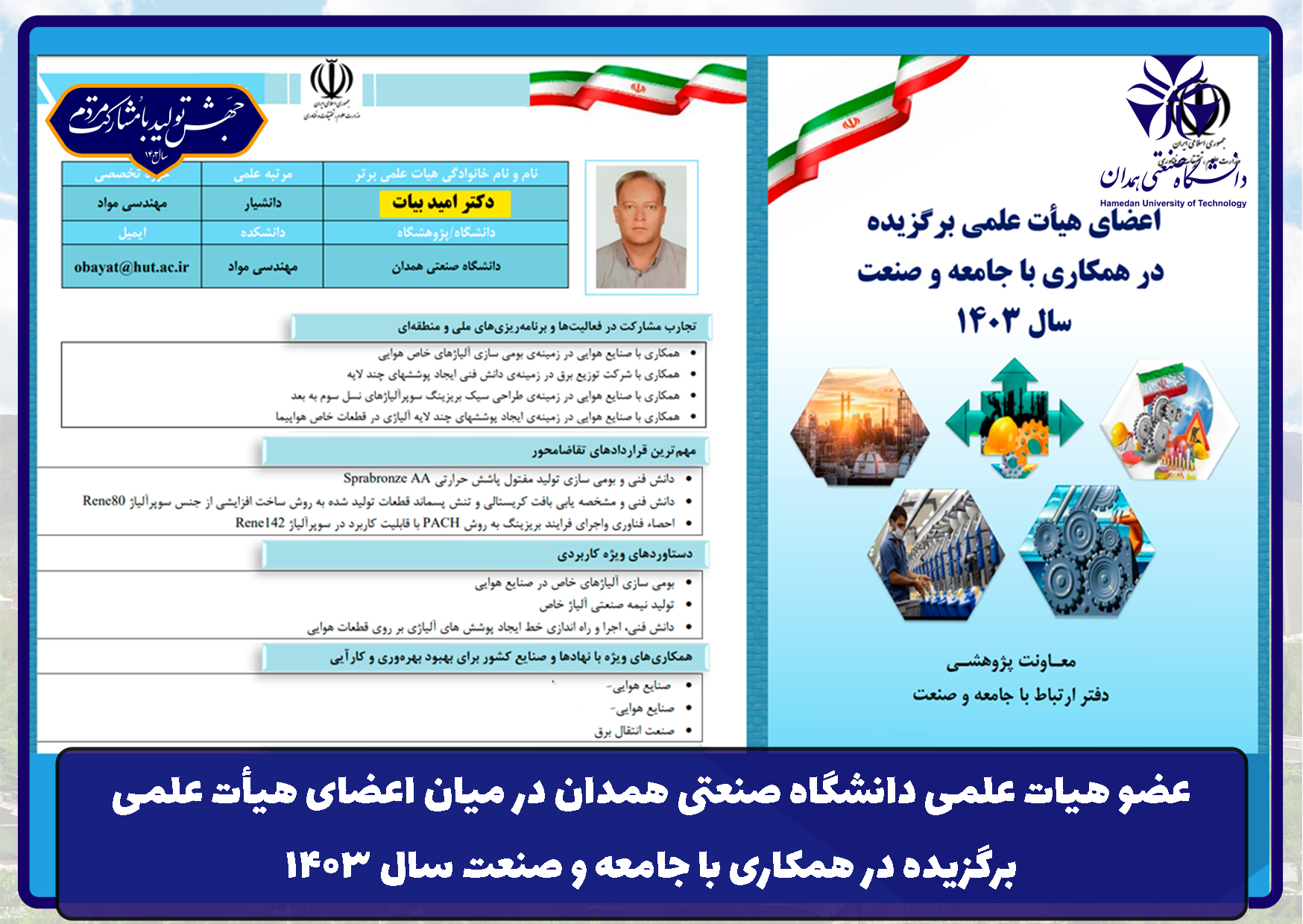 دکتر امید بیات؛ عضو هیات علمی گروه مهندسی مواد دانشگاه صنعتی همدان در میان اعضای هیأت علمی برگزیده در همکاری با جامعه و صنعت سال ۱۴۰۳ قرار گرفت.