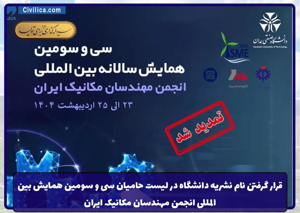 قرار گرفتن نام نشریه دانشگاه در لیست حامیان سی و سومین همایش بین المللی انجمن مهندسان مکانیک ایران