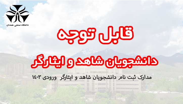 ثبتنام دانشجویان شاهد و ایثارگر جدیدالورود دانشگاه صنعتی همدان برای سالتحصیلی ۱۴۰۴-۱۴۰۳ شامل (جانبازان ۲۵٪ و بالاتر، آزادگان، همسر و فرزند شهید، جانباز ۲۵٪ و بالاتر و آزاده) آغاز شد.