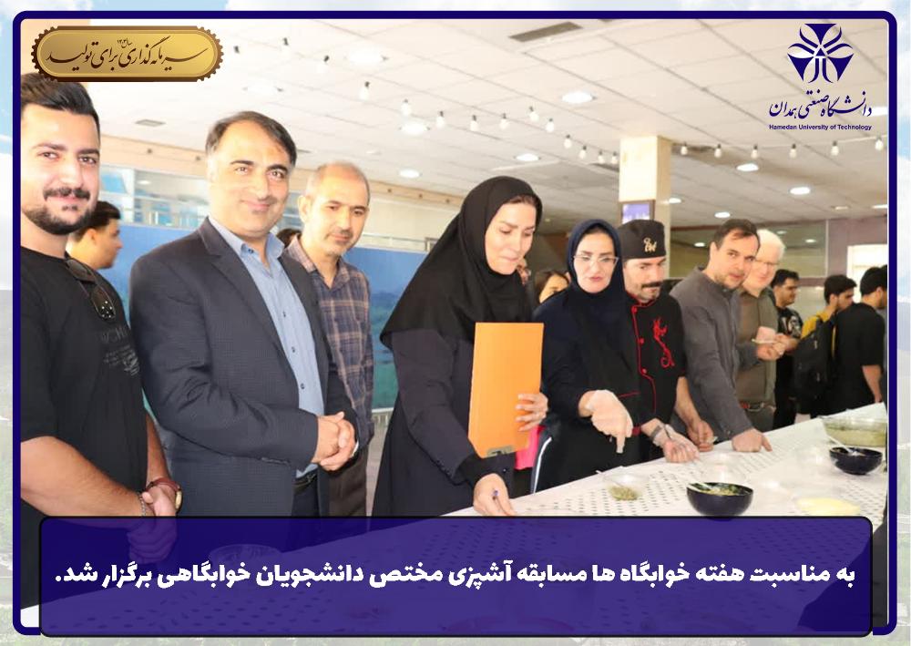 به مناسبت گرامیداشت هفته خوابگاهها، یک دوره مسابقه آشپزی ویژه دانشجویان ساکن خوابگاه با حضور مسئولین دانشگاه برگزار شد. این برنامه با هدف ایجاد فضای شاد، ارتقای روحیه جمعی و تقویت مهارتهای زندگی دانشجویی در محیط خوابگاه برگزار گردید.