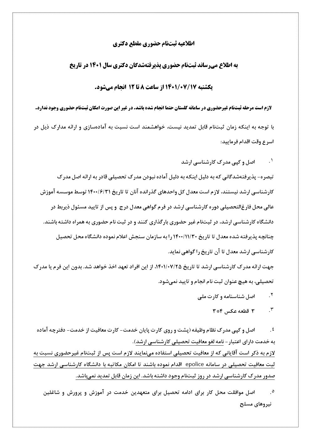اطلاعیه مهم در خصوص تاریخ ثبتنام حضوری پذیرفتهشدگان مقطع دکتری